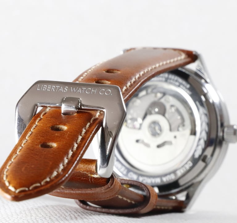 Já na parte traseira da caixa, o movimento mecânico é exibido com folhas de café gravadas ao seu redor, símbolo do desenvolvimento mineiro que figuram no brasão de armas do estado. A frase "Deixe sua marca no tempo" reflete nosso propósito de incentivar o potencial de cada portador de nossas peças.